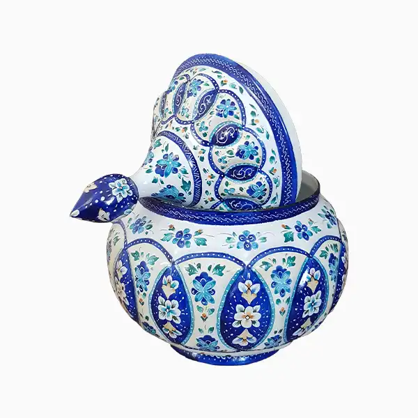 قندان میناکاری طرح شکوفه آبی ، نمونهای اصیل از هنر میناکاری روی مس است که در کارگاههای هنری اصفهان با دستسازترین روشها تولید میشود. بدنه این قندان از فلز مس ساخته شده و پس از لعابکاری، با نقوش گلدار و رنگهای آبی، سفید و فیروزهای تزئین شده است. طرحهای استفاده شده در این قندان، برگرفته از نقوش سنتی ختایی و گل شاهعباسی هستند که جلوهای چشمنواز به ظرف میبخشند.