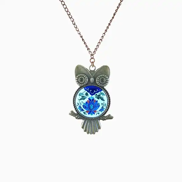 گردنبند جغد میناکاری (Enamel owl necklace) یک جواهر هنری و منحصربهفرد است که با ظرافت و دقت بالایی طراحی و ساخته شده است. این گردنبند میناکاری شده دارای قابی به شکل جغد است که نمادی از خرد و دانایی در فرهنگهای مختلف به شمار میآید. در مرکز این قاب زیبا، پلاک گردی از میناکاری با هنر دست چسبانده شده که جلوهای خیرهکننده به گردنبند میبخشد.