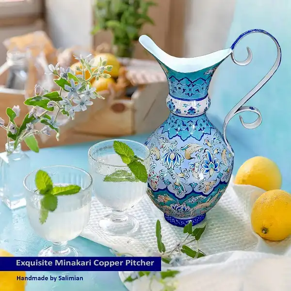 • هنر دست‌ساز: هر قطعه از این پارچ میناکاری با دقت و ظرافت ساخته شده و با لعابی مقاوم پوشانده شده است.