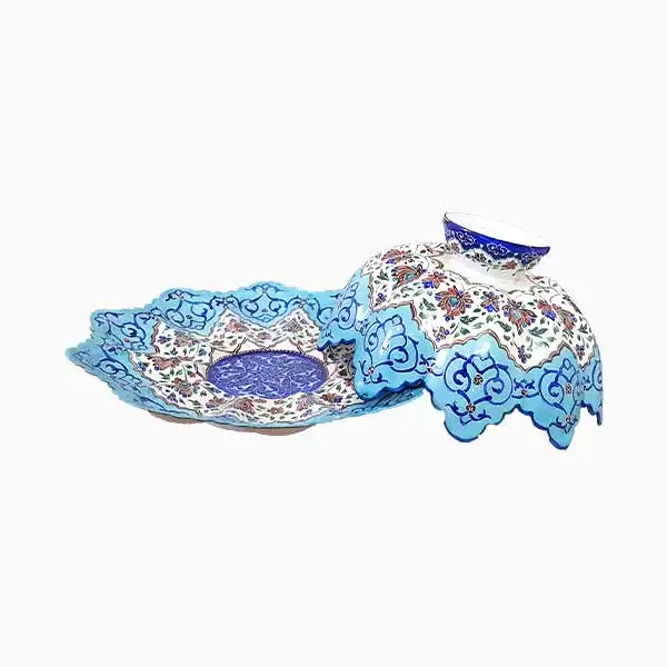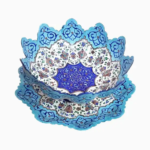 فرم کاسه نیز از فرم بشقاب الهام گرفته و همان طرح‌ها و نقوش بر روی تمام سطح کاسه اعمال شده‌اند، که این موضوع زیبایی و هماهنگی بیشتری به این مجموعه می‌بخشد. این توجه به جزئیات و هماهنگی در طراحی، این ظرف میناکاری اصفهان را به یک اثر هنری منحصر به فرد تبدیل کرده است.