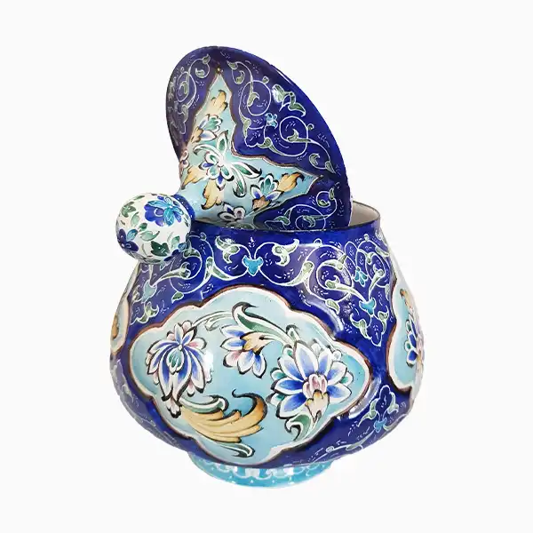 قندان میناکاری مدل دیزیخوری کاربردی است. داخل آن میتوان قند، نبات یا شکلات گذاشت. روی میز پذیرایی جلوه خاصی ایجاد میکند و در کنار دیگر ظروف سنتی قرار میگیرد.