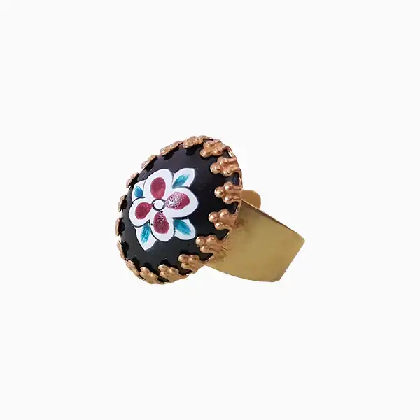 اگر به دنبال یک اکسسوری میناکاری خاص و هنری برای کامل کردن استایلتان هستید، این انگشتر میناکاری گل پنج پر با زمینه مشکی و قاب طلایی انتخابی ایدهآل است. طراحی دستساز و نقاشی گل پنج پر با رنگهای سفید، رژه ای و ویکتوریا روی زمینهی مشکی، جلوهای چشمنواز و متفاوت ایجاد کرده است که هم حس اصالت ایرانی دارد و هم مناسب سلیقههای مدرن است.