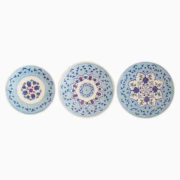 تابلو میناکاری سه تایی (یا بشقاب سری سه تایی میناکاری ) انتخابی بینظیر است. این مجموعه شامل سه بشقاب میناکاری با سایزهای 8، 10 و 12 سانتیمتر است که با رنگهای فیروزه ای لاجورد و قرمز و نقوش اسلیمی ختایی، فضایی گرم و دلنشین را در خانه شما ایجاد میکنند.