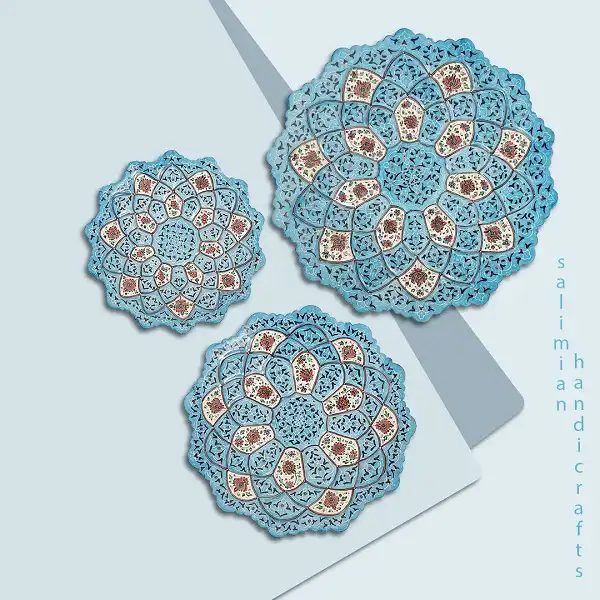 بشقابهای میناکاری با نقوشی مانند گلهای شاه عباسی، طرحهای اسلیمی و رنگهای زنده مانند فیروزه ای، لاجوردی و سفید تزئین میشوند. - کیفیت بالا و ماندگاری: